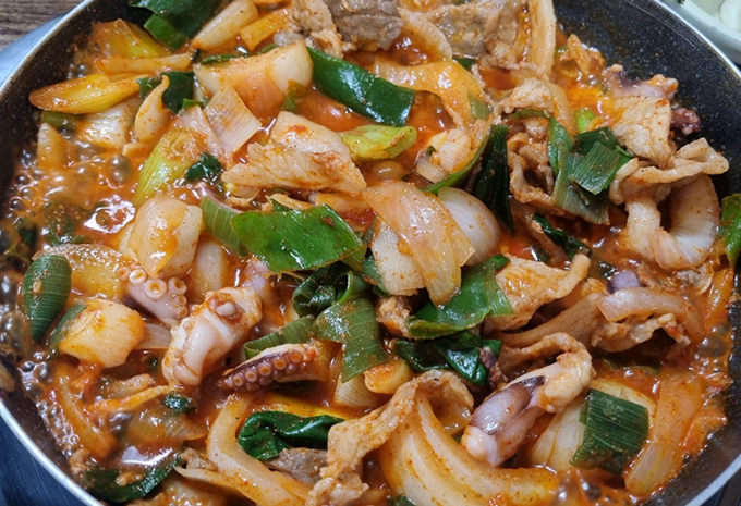 볶음용 팬에 여러 채소와 낙지, 그리고 돼지고기가 수북이 얹어 나오고, 국물이 자박자박해질 정도로 잘 볶아 먹는다. 상추에 싸서 먹기도 하고, 함께 나오는 대접에 밥과 함께 콩나물들을 곁들여 비벼 먹는