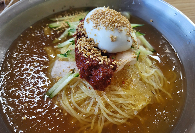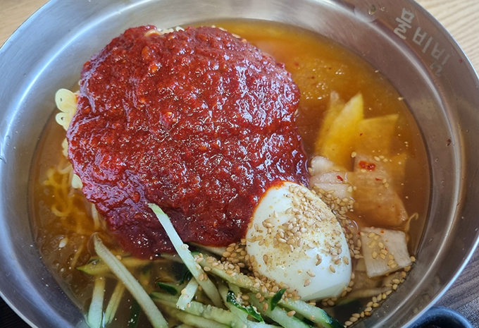 물밀면의 맛을 함께 느끼는 방법이다. 물밀면은 심심하고 비빔밀면을 먹기엔 육수가 아쉽다면 물비빔도 있다. 자박자박한 육수에 감칠맛 나는 양념장이 듬뿍 올라가 있다.