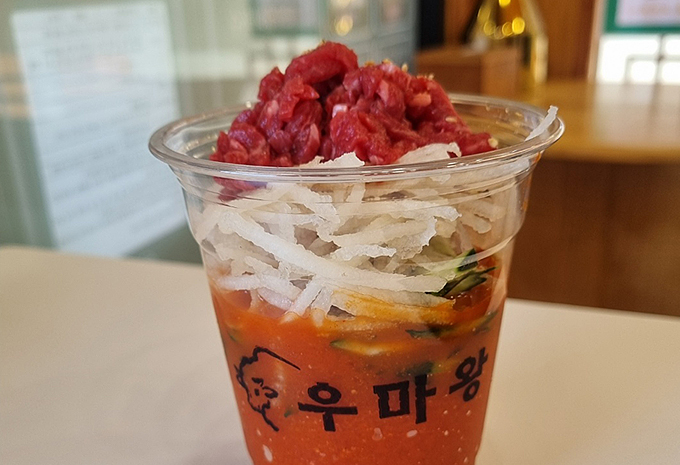 우리가 흔히 아이스 아메리카노를 테이크아웃할 때 사용하는 투명한 플라스틱 컵에 물회의 육수, 오이를 비롯한 갖은 채소와 그 위에 신선한 한우 육회가 올라간다. 육회의 한우는 기름기가 적은
