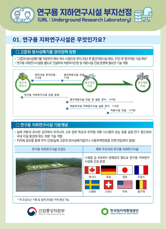 고준위 방폐장과는 별개의 부지에 건설하는 순수 연구시설로써, 운영 과정에서 사용후핵연료, 방사성폐기물은 전혀 반입되지 않는다. 미국ㆍ독일ㆍ스웨덴ㆍ스위스ㆍ캐나다ㆍ벨기에ㆍ프랑스ㆍ일본 등 8개국이 연구용 지하연구시설인 URL을 운영 중이거나 과거 운영한 바 있다.