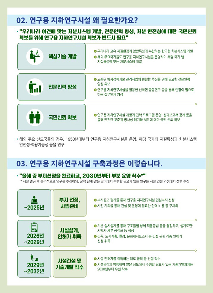 연구용 지하연구시설에서는 국내 지질환경에 적합한 처분시스템 개발과 처분개념 연구 등 고준위 방사성폐기물 처분과 관련한 여러 기술개발과 함께 전문인력양성 등이 이루어질 예정이다.