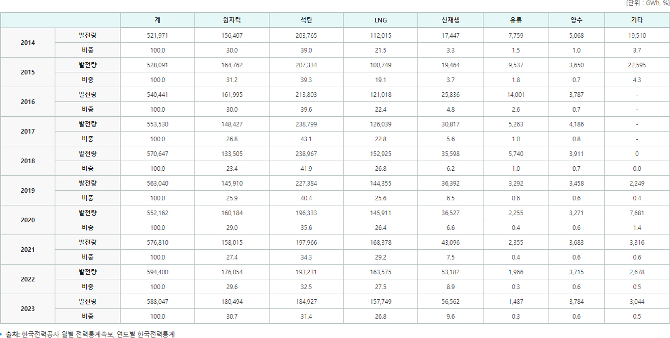 석탄이 약 31%, LNG가 약 26%, 나머지 에너지원들이 10% 미만 남짓인 것을 두고 보면 우리나라 전력의 1/3은 원자력발전으로 이루어지고 있다고 해도 과언이 아닐 것이다.