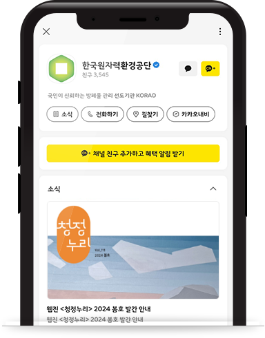 한국원자력환경공단 카카오 채널을 구독하면 모바일 사보와 이벤트 정보 등 다양한 소식을 받아보실 수 있습니다.