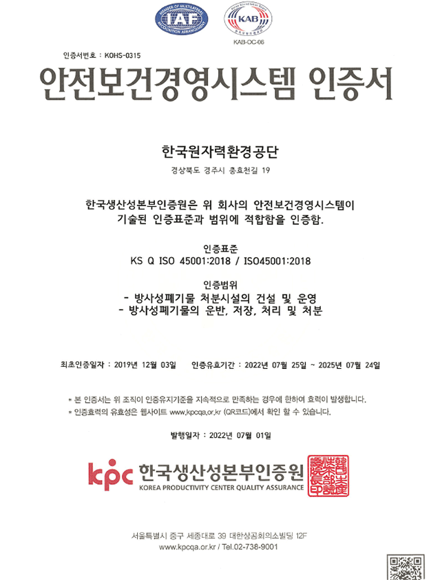 KORAD는 ‘안전’이 공단 사업 수행의 최고 가치라고 생각해요. 방폐물의 안전한 관리와 처분시설의 안정적 운영을 중점가치로 두고 전사적인 안전보건경영 관리체계를 수립하면서 산업재해가 발생하지 않는 <산업재해 Zero>를 선언, 국민과 근로자의 안전을 위해 <방사선 피폭 기준 만족>을 달성하고 있습니다.