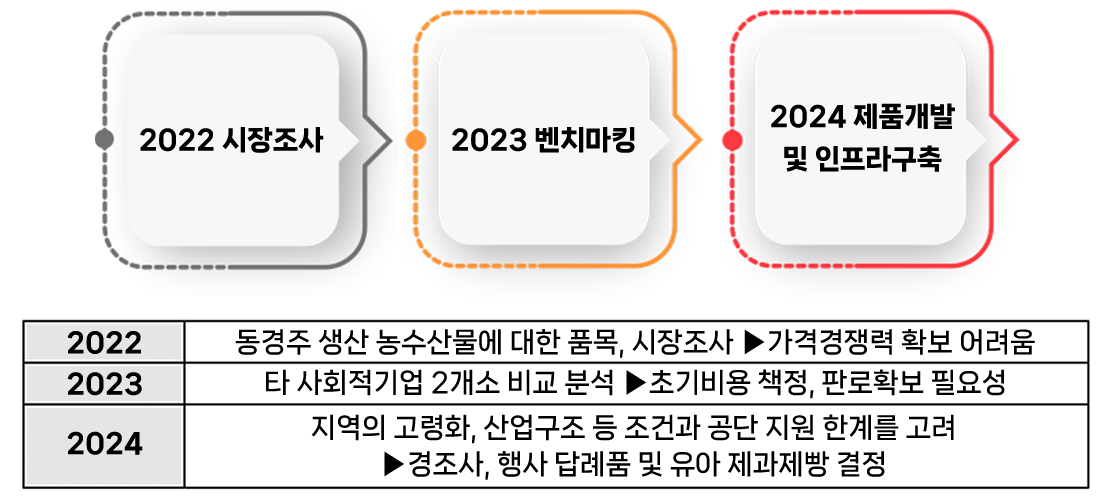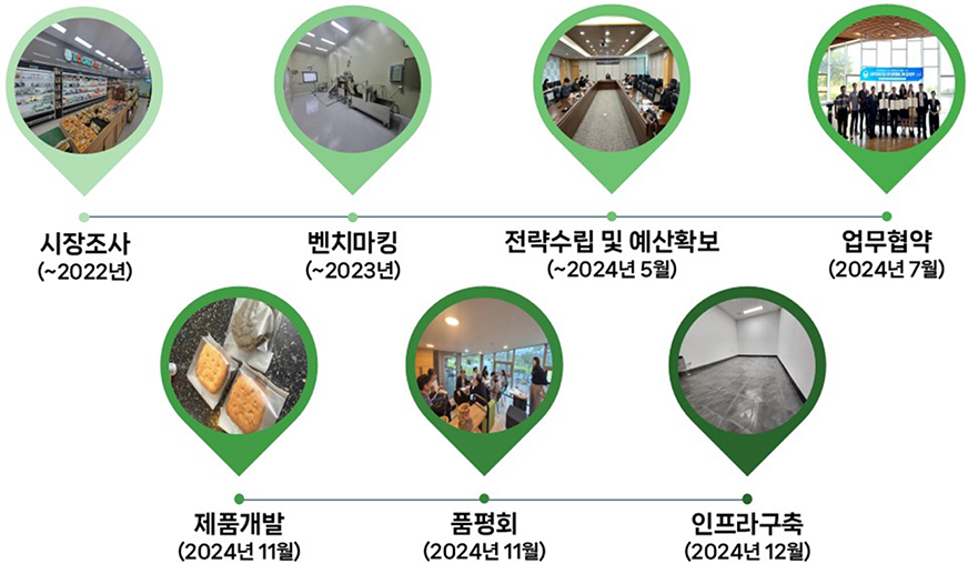 2022년 시장조사, 2023년 벤치마킹, 2024 제품 개발 및 인프라구축 과정을 거쳐 ‘못난이 제과제빵 사업’ 제품 개발이 완료되었다.