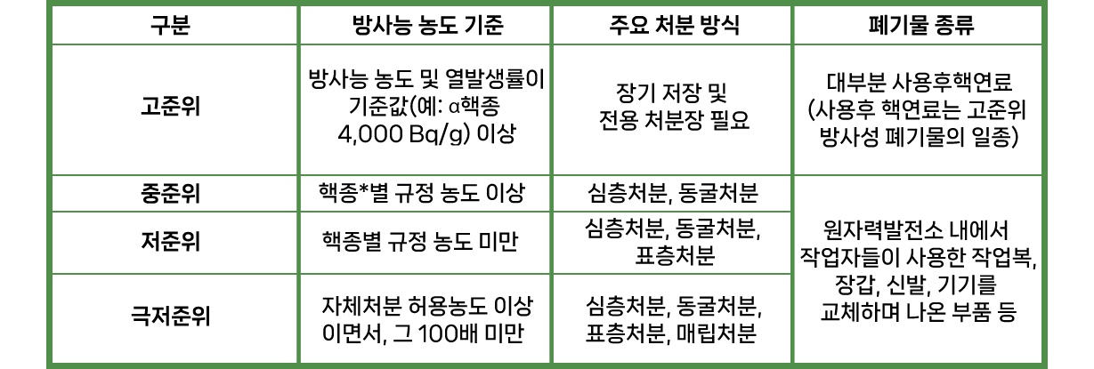 국제원자력기구(IAEA)도 지하 500m 이상 깊이에 처분할 것을 권고하고 있으며 우리나라도 이를 기준으로 안전한 관리를 추진 중이다.