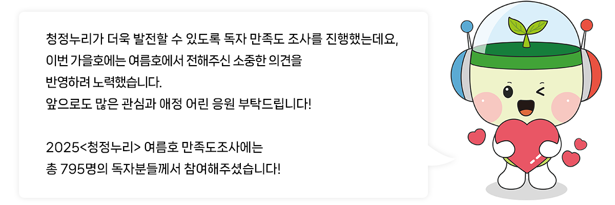 2025년 가을, 더욱 풍성해진 <청정누리> 가을호를 읽고 만족도 조사에 참여해 주세요!