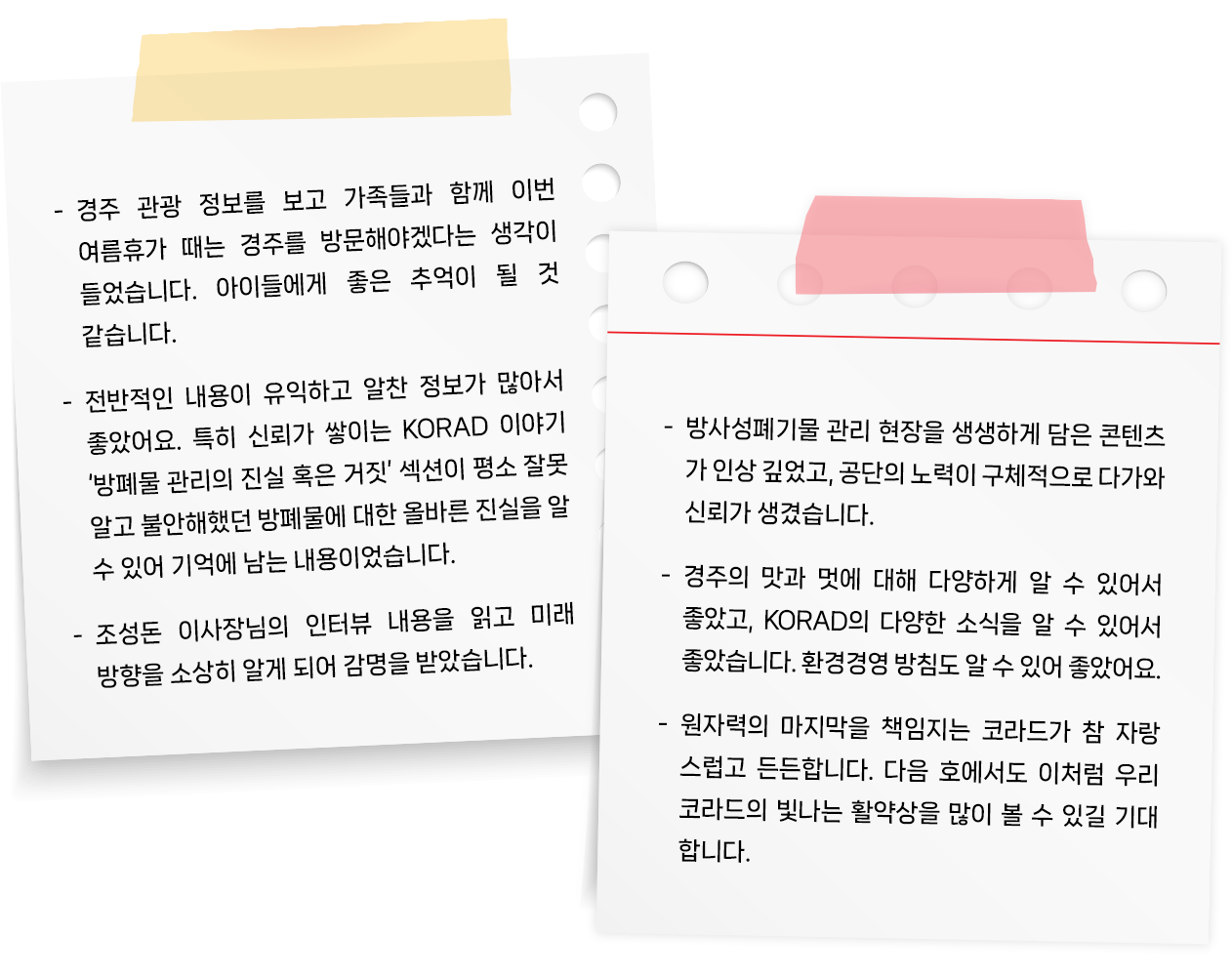 보고 싶은 주제, 알고 싶은 정보, KORAD에 바라는 점, 혹은 일상 속 작은 이야기까지
